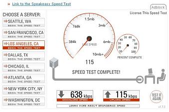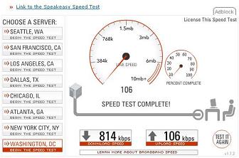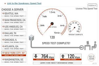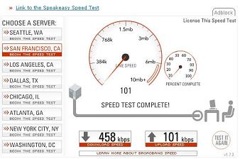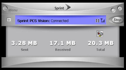 Rev 0 Results Run with a Sierra 580 Rev 0 Air Card These results were run from Lancaster, Pa. at about 2:00 in the afternoon in April 2006. Having traveled to other states, and run the same speed tests, sometimes they produce similar results, other times results may be slower, by as much at 50%. Again, time of day, traffic, and a whole host of other things can cause the connection to slow down. At the bottom of the page is the Sprint connection manager, which shows what the connection looks like when in a broadband area. Notice the arrows pointing upwards and downwards. Note that these results are in kilobits per second. Actual downloading of files will be about 8 - 10 % of this and will be in KiloBytes per second. |