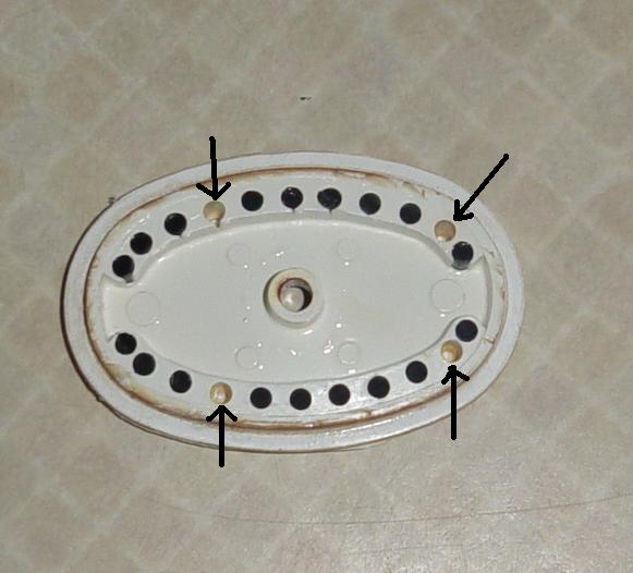 Remove the center screw, remove the insert, and flip the insert over. Here you can see that all but the 4 holes with the arrows have been plugged with an o-ring of the appropriate size. I cut the o-ring, force it into the hole, then, cut it off. This will allow me to remove any or all of these plugs at a later time, should I ever want to return to a full flow rate. Water only flows through the 4 holes shown, which drastically increases pressure at the head, as well as reducing the flow rate, and really conserves water. Typically, we only use the water pump onboard, even when in a campground, and can tell by the sound of the pump, how much water we are using. Normally, with the correct rate of water flowing, the pump will run about 1 second, then stop for 1 second, and repeat. If you open the shutoff valve more, then the pump will run more, and use more water. If you close the shutoff more, then the pump runs less, and you conserve more water. Typically, we take military showers, where we run water long enough to get fully wet, shut off the water, with the shutoff button on the head, wash body and head with the water shut off, then turn the water back on and rinse off. This typicaly results in about a gallon or so of water per shower, per person. Our Motor Home has a 55 gallon fresh water tank, and between showers, washing dishes, using the water for 2 pots of coffee per day, brushing teeth, etc., one tank will last us for 7 to 10 days. The big factor is how many loads of dishes we do during the week. We can actually use more water washing dishes, than we do taking showers. If we use a lot of paper products, then the water lasts in the 10 day range. If we wash more dishes, then we get about 7 days. Our grey tank is 30 gallons, and the black tank is 20 gallons, and it works fine for the 2 of us. |