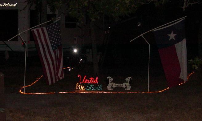 Not sure how well this will show up on your monitor. There is an American flag on the left, a Texas flag on the right, and the "United We Stand", and the 2 little dogs holding a "bone" with the name of the people in the middle. |