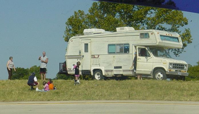 If you look closely, there are 8 people and a dog here. There was another person inside the motorhome. It's not very large for that number of people. |