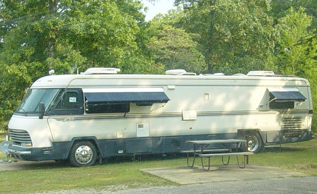 This older Motor Home was parked near us Wednesday night. It is an Holiday Rambler, and is a diesel pusher, somewhere in the area between 36 and 40 foot long. |