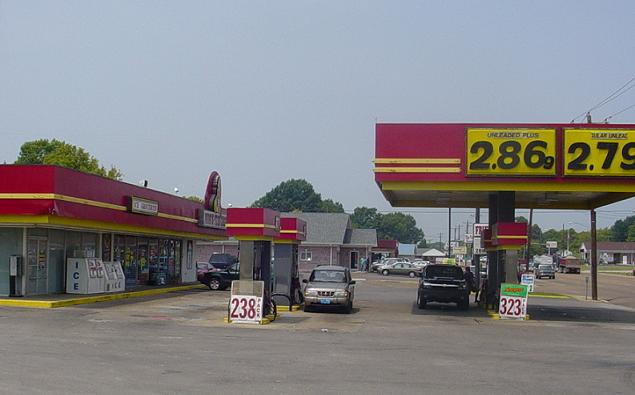 Where we bought gas, this morning. $2.79 is the cheapest we have seen gas for a while. Note that on the left side of the picture, someone hit the corner of the building, just to the left of the ice machines. |