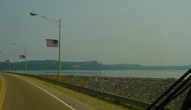 About to cross a dam. Note the houses built into the side of the hill on the far side. |