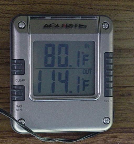 How's this for hot? Actually, it wasn't this hot outside. This was when the thermometer was in full sun while we were parked for a short time. |