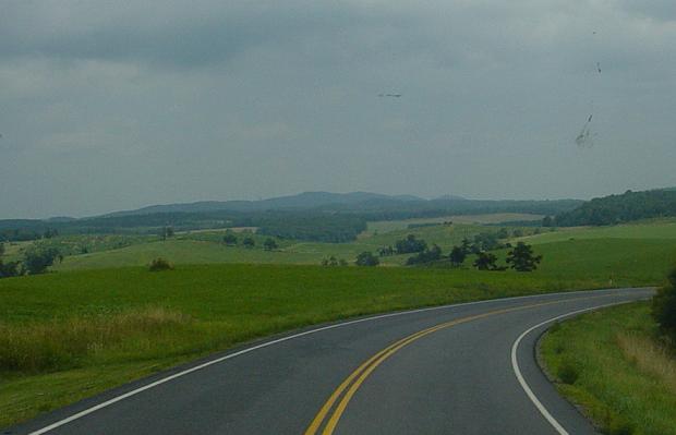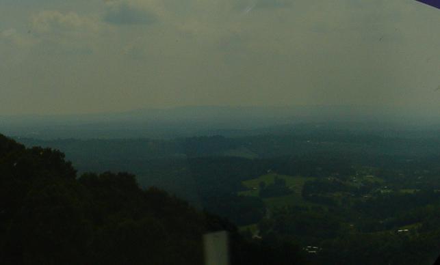 Poor picture, but if you look close, you can see the mountains in the distance, and in the foreground the valley below. We were a couple of thousand feet in the air when this was taken, at the southern end of Virginia. |