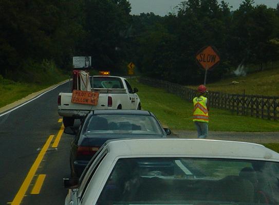 This is one way to control how fast the traffic goes through a road contruction area. The sign says "Pilot Car, Follow Me". |