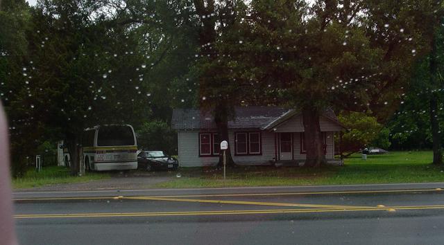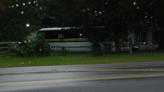 Note the air conditioner hanging out the side window a bus parked in someones driveway. |