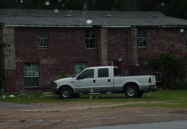 Note the upstairs windows. Especially the 2 center ones, full of duct tape. |