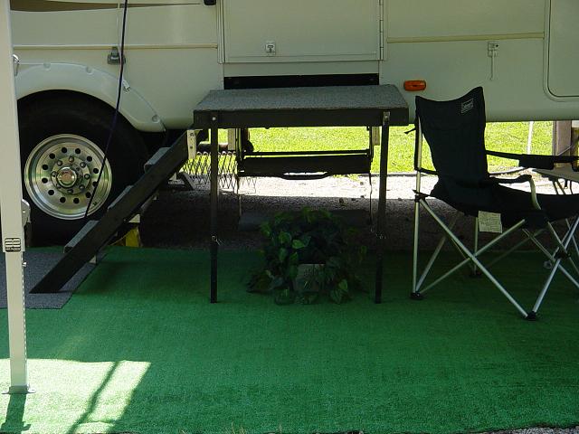 This was just another 5th wheel in the campground. This was not in the "extended stay" area. I thought this was a good idea. The guy built some steps and a landing out of wood, bolted the whole thing to the original 5th wheel steps and it gives them 4 steps instead of 3 and a landing at the top. I may have to come up with something like that for ours. |