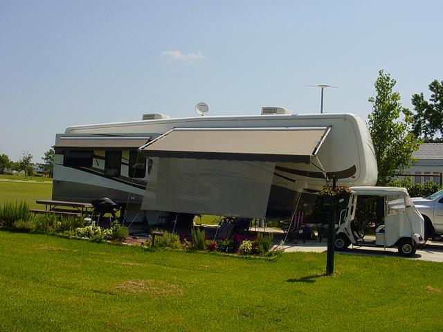 Another 5th wheel, with awnings out, golf cart at the ready, all on a concrete slab. |