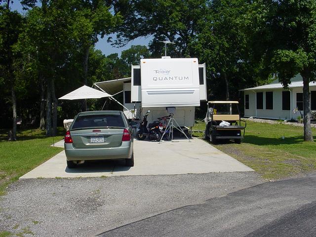 And a close shot of the Park Model. Notice the Motorcycle and the little red trailer for it. The antenna on the roof is not for tv, but for Internet access. |