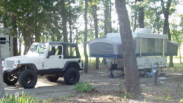 A Jeep with a Popup trailer. Note the blue tank along side of the popup, being used for waste water. |