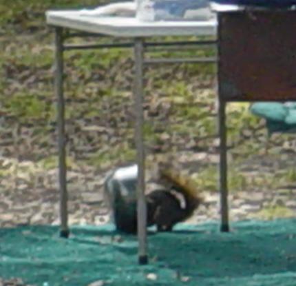 This squirrel has his head in a dish, trying to eat. |