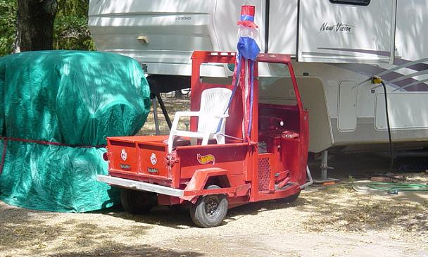 Somebody using a Cushman to get around. Note the chair strapped on the back for a passenger. |