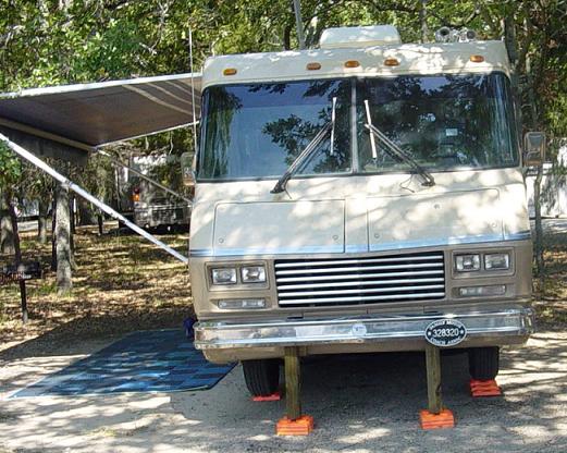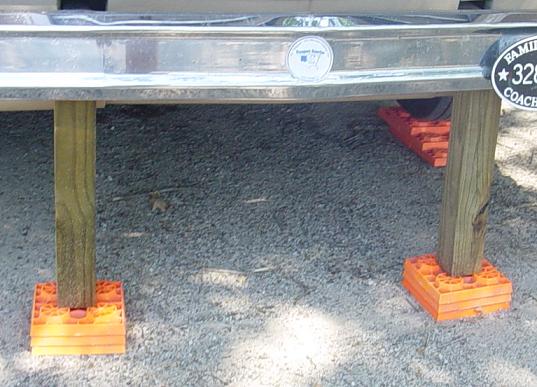 This is the low buck solution for helping to take some of the movement out of the rig while parked. Just a 4 x 4 x 8 cut to length. The plastic levelers, we had purchased quite some time ago. About 7 bucks for the 4 x 4. |