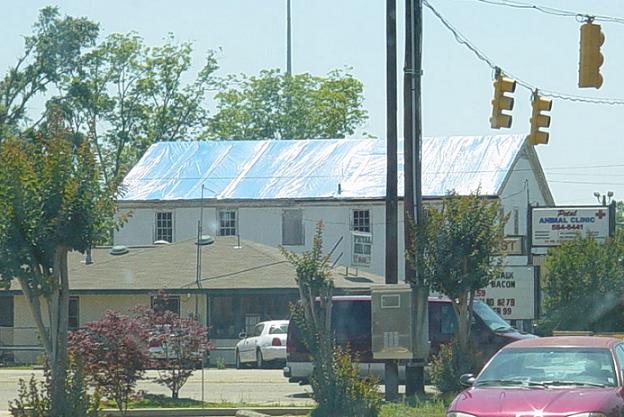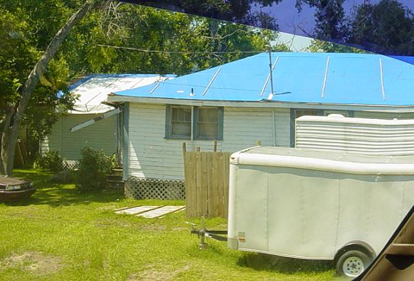 Another Katrina damaged roof. Note the blue tarp nailed to the roof. |