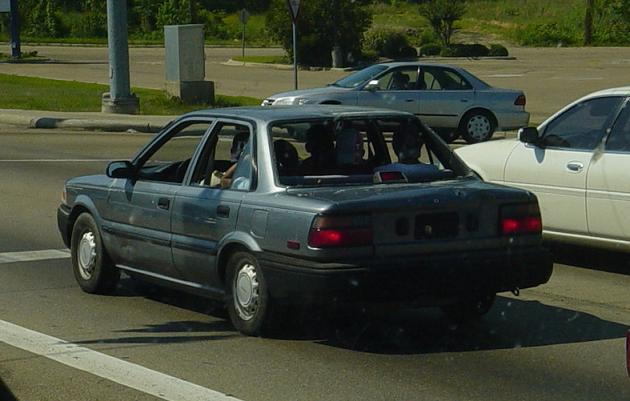 5 kids riding around in a beat up car. All the windows were down, and the back window was broken out, in addition to not having any license plates on it. The left door is dented, as is the trunk lid. Looked like they were trying to have some fun, though. |